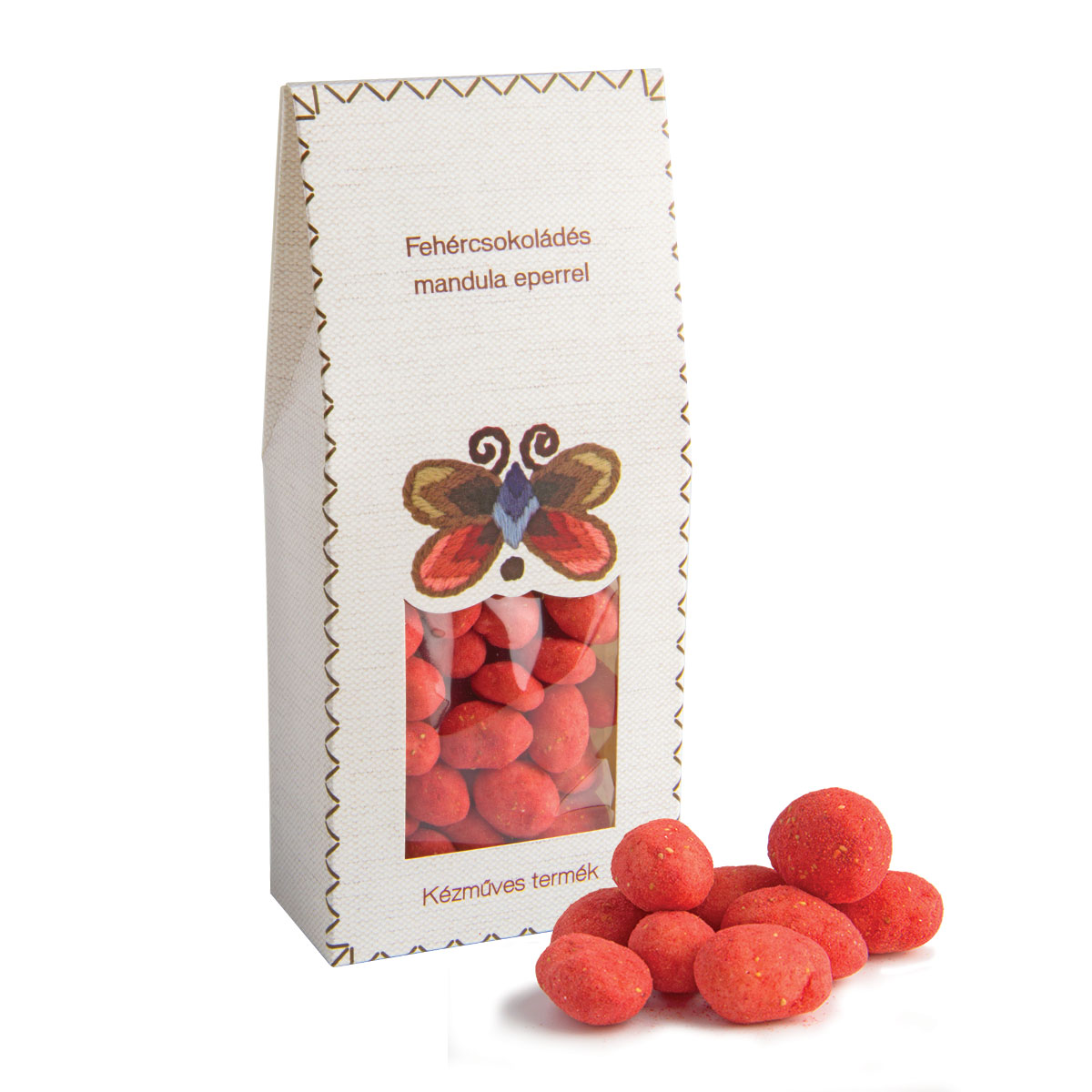 Fehércsokoládéval bevont mandula liofilizált eper porral