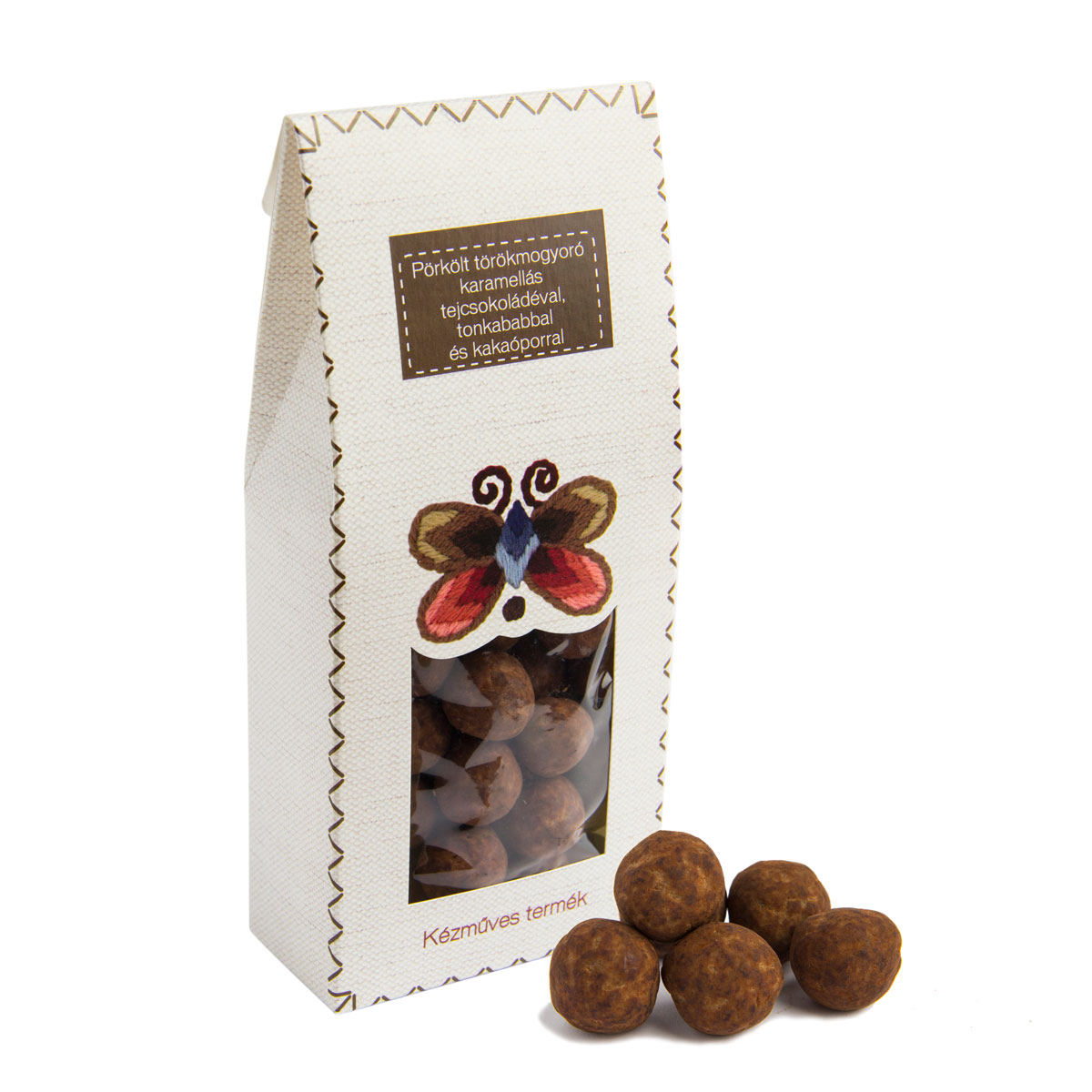 Pörkölt törökmogyoró karamellás tejcsokoládéval, tonkababbal és kakaóporral