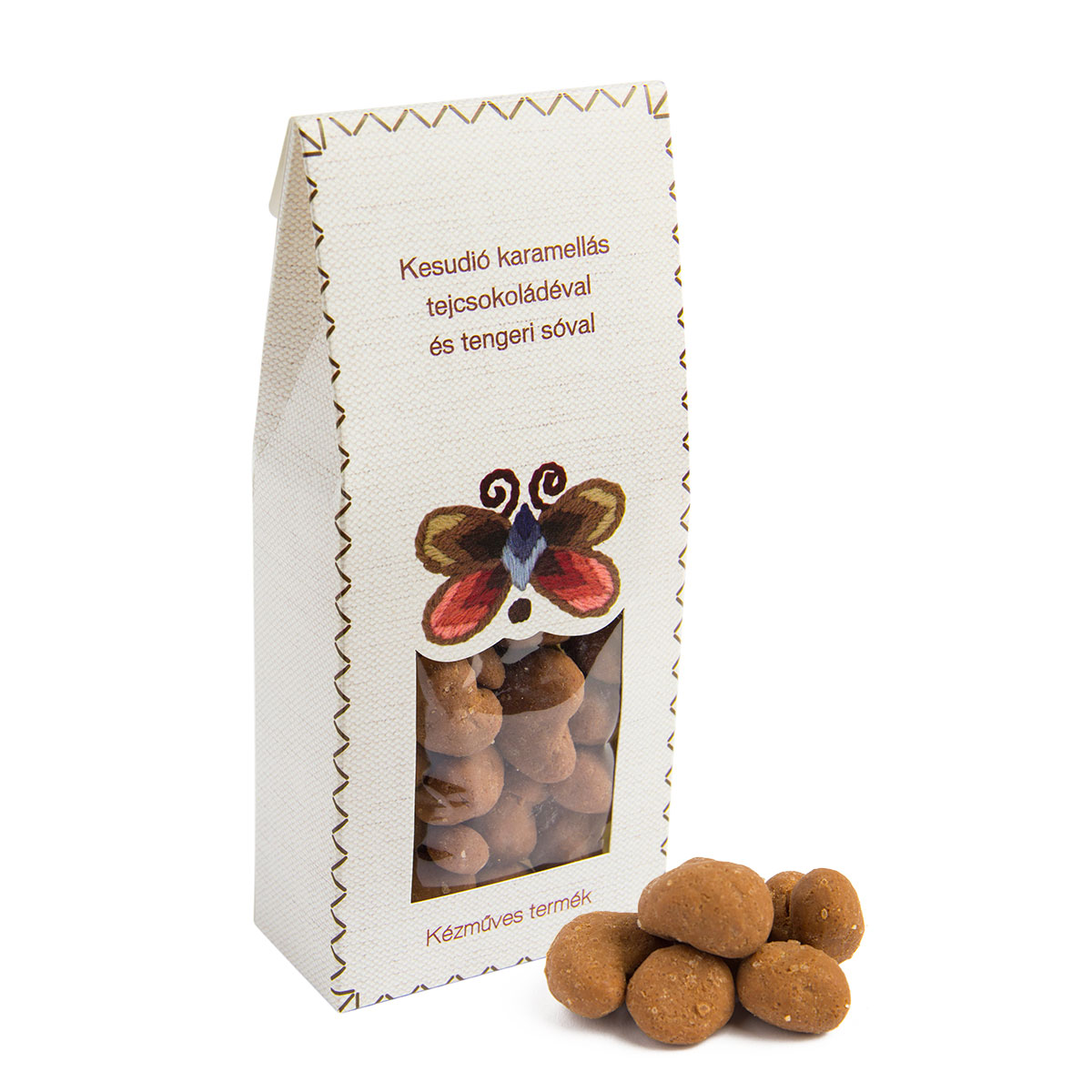 Karamellás tejcsokoládéval bevont kesudió tengeri sóvirággal