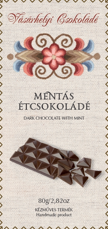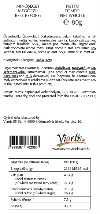 Összetevők: Kakaómassza, kakaóvaj, cukor, emulgeálószer: szójalecitin, természetes vanília, kakaó szárazanyag tartalom legalább 73%, menta por, mentaolaj.
