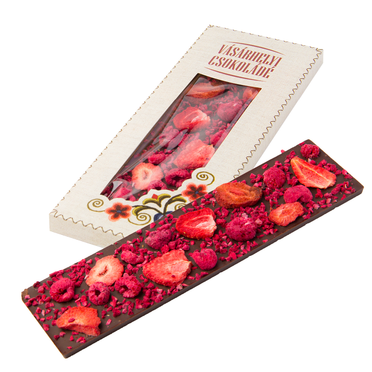 Összetevők: Étcsokoládé (kakaómassza, kakaóvaj, cuko, emulgeálószer: szójalecitin, természetes vanília, kakaó szárazanyag tartalom: 73%), liofilizált málna szemek, liofilizált eper szeletek, liofilizált málna darabok.
