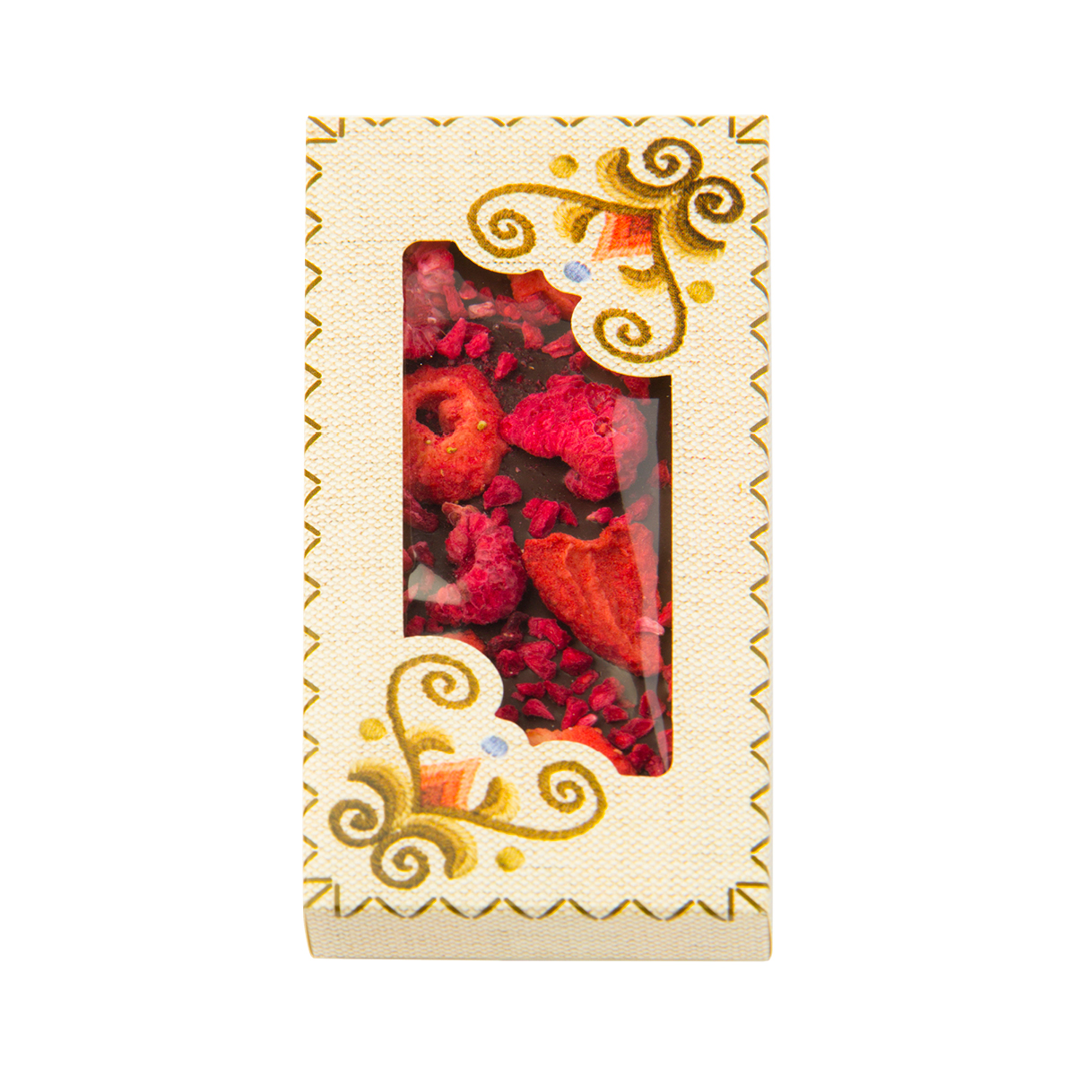 Összetevők: Étcsokoládé (kakaómassza, kakaóvaj, cukor, emulgeálószer: szójalecitin, természetes vanília, kakaó szárazanyag tartalom: 73%), liofilizált málna szemek, liofilizált eper szeletek, liofilizált málna darabok.
