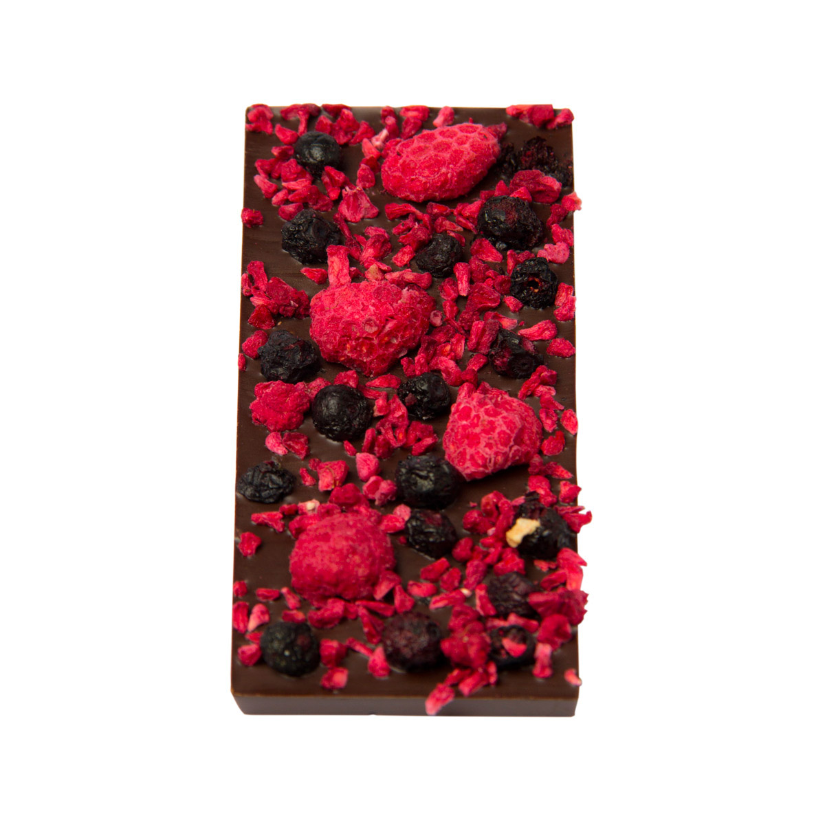 Étcsokoládé liofilizált málnával és liofilizált fekete áfonyával.