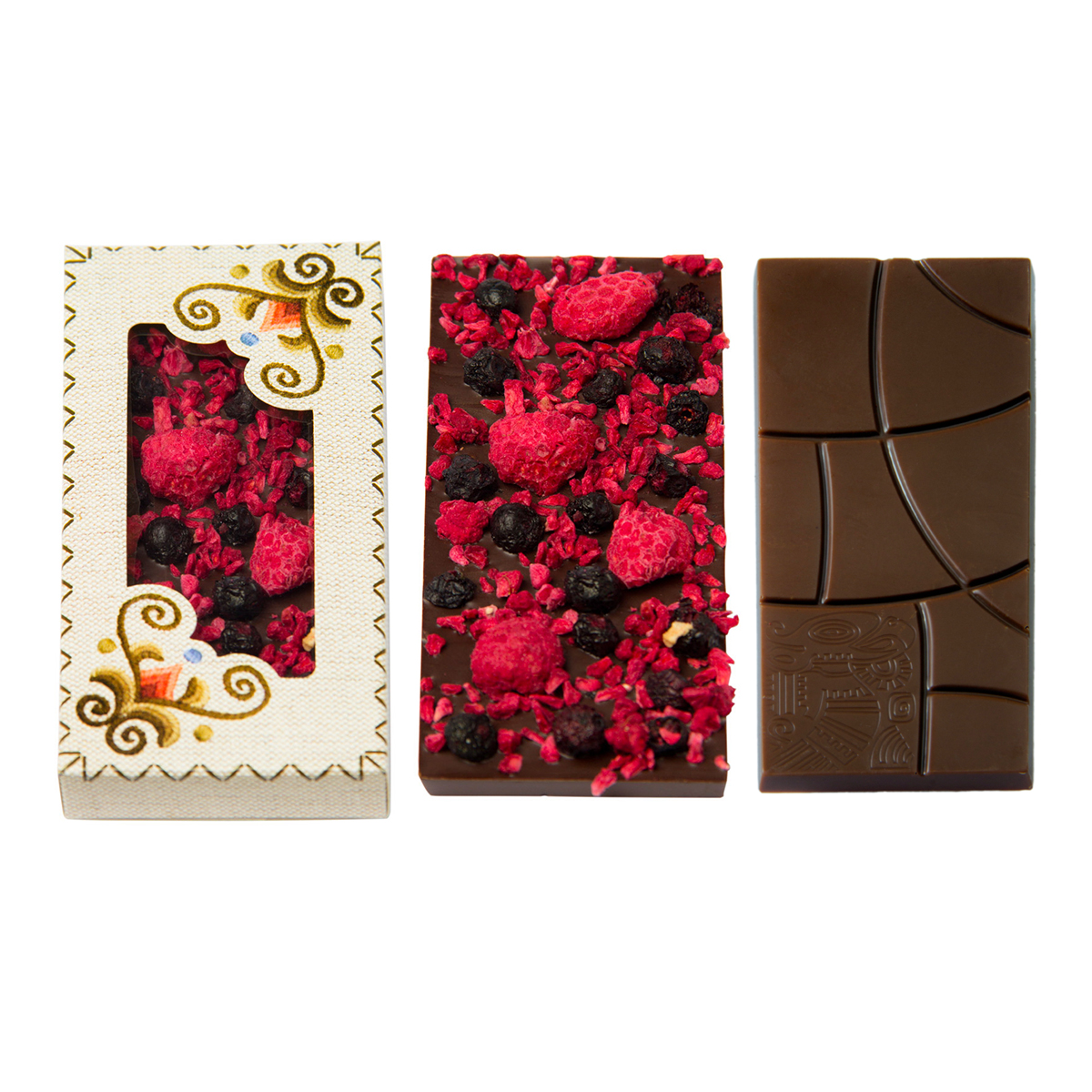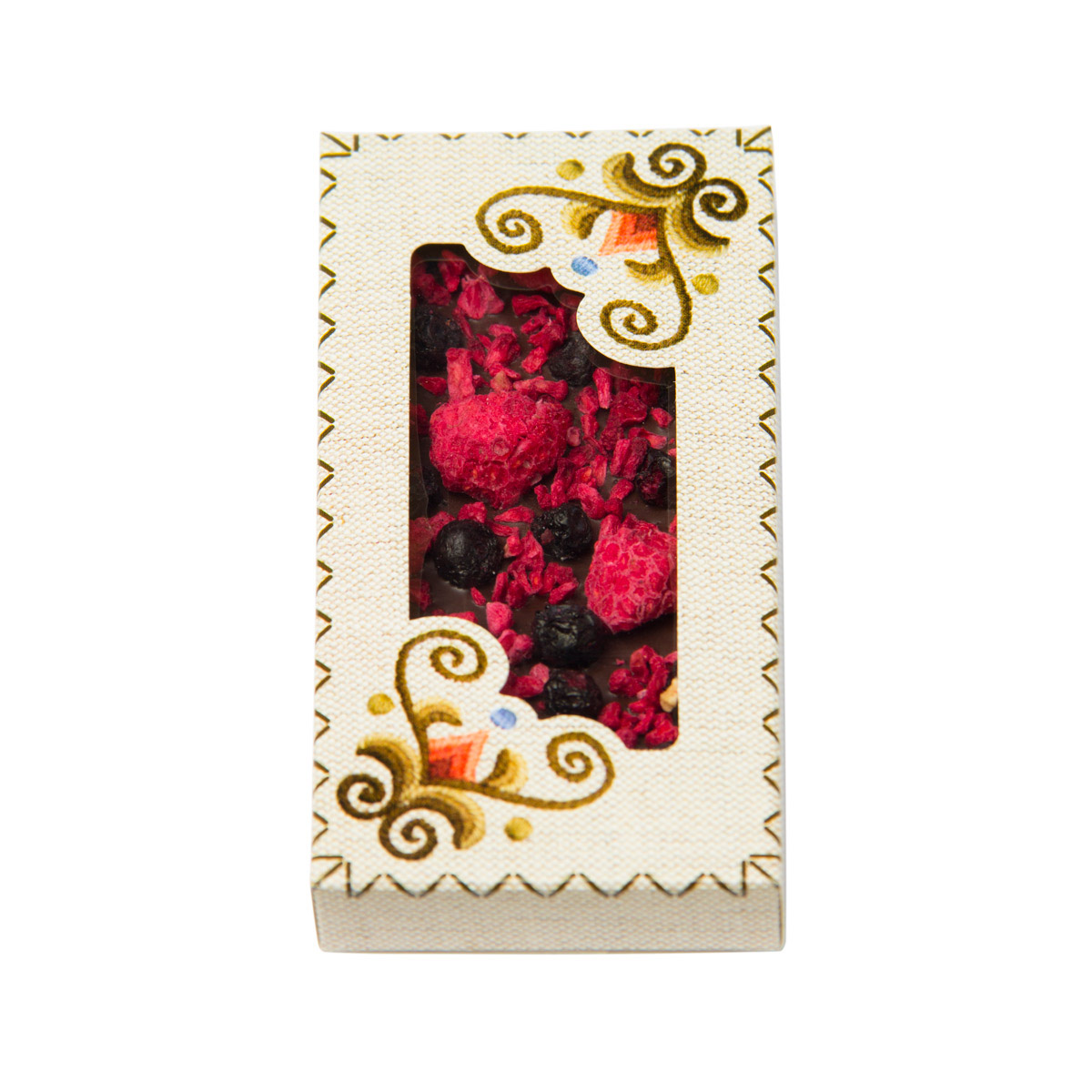 Összetevők: Étcsokoládé (kakaómassza, kakaóvaj, cukor, emulgeálószer: szójalecitin, természetes vanília, kakaó szárazanyag tartalom: 73%), liofilizált málna szemek, liofilizált fekete áfonya szemek, liofilizált málna darabok.