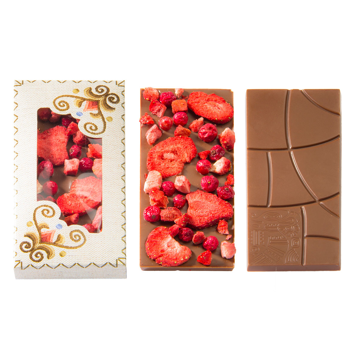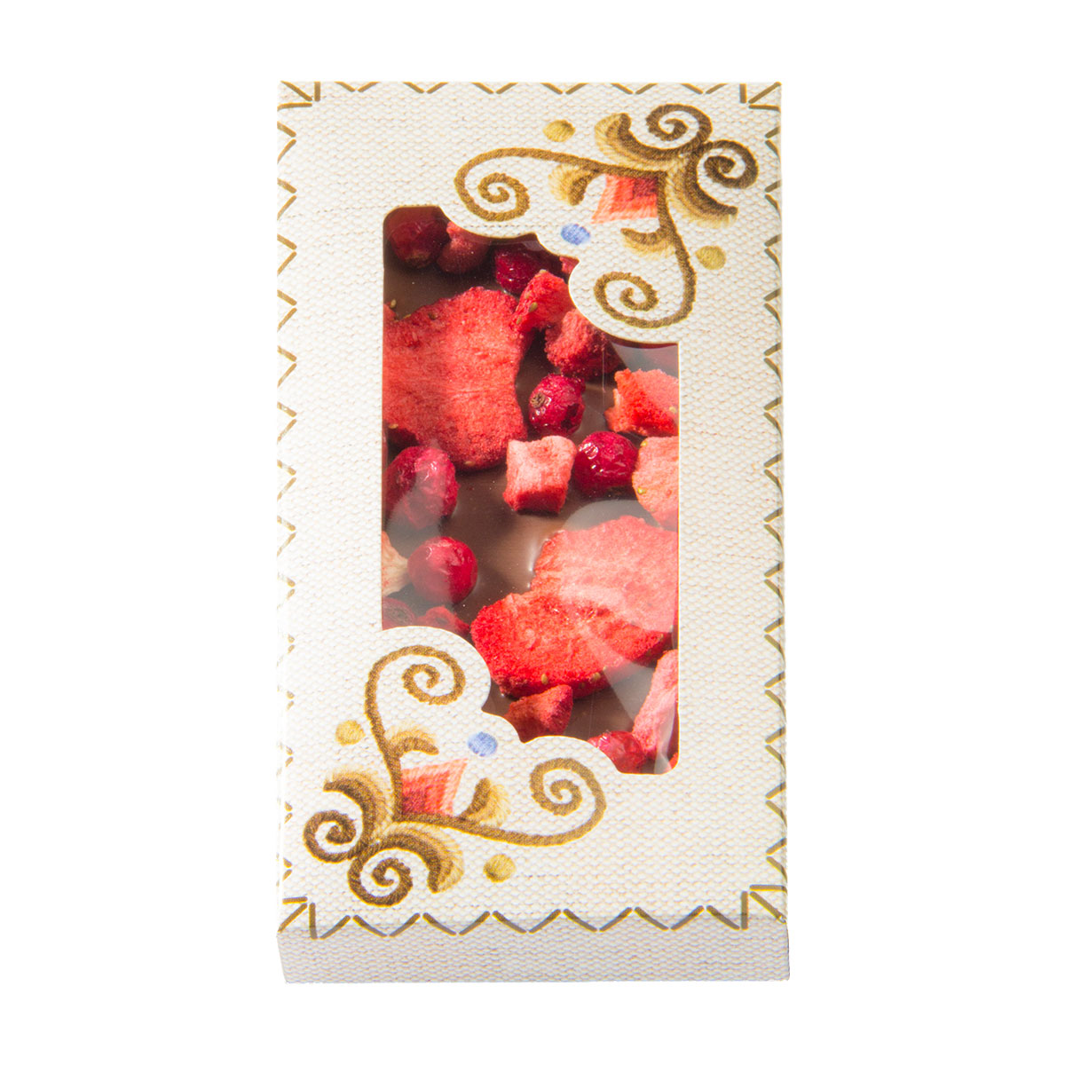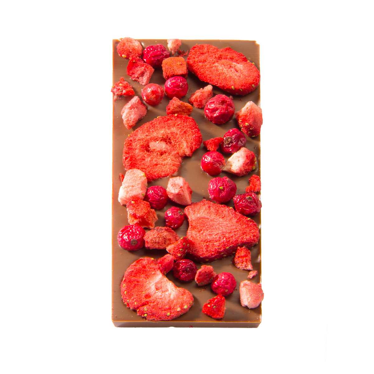 Tejcsokoládé liofilizált eperrel és liofilizált piros ribizlivel