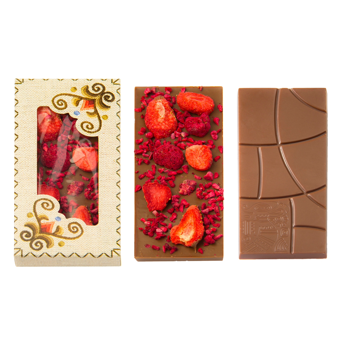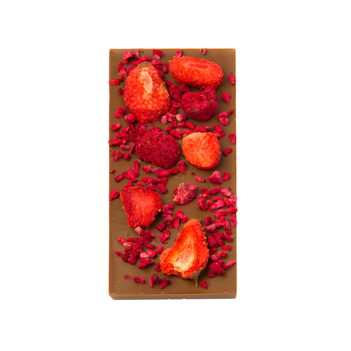 Tejcsokoládé liofilizált málnával és liofilizált eperrel