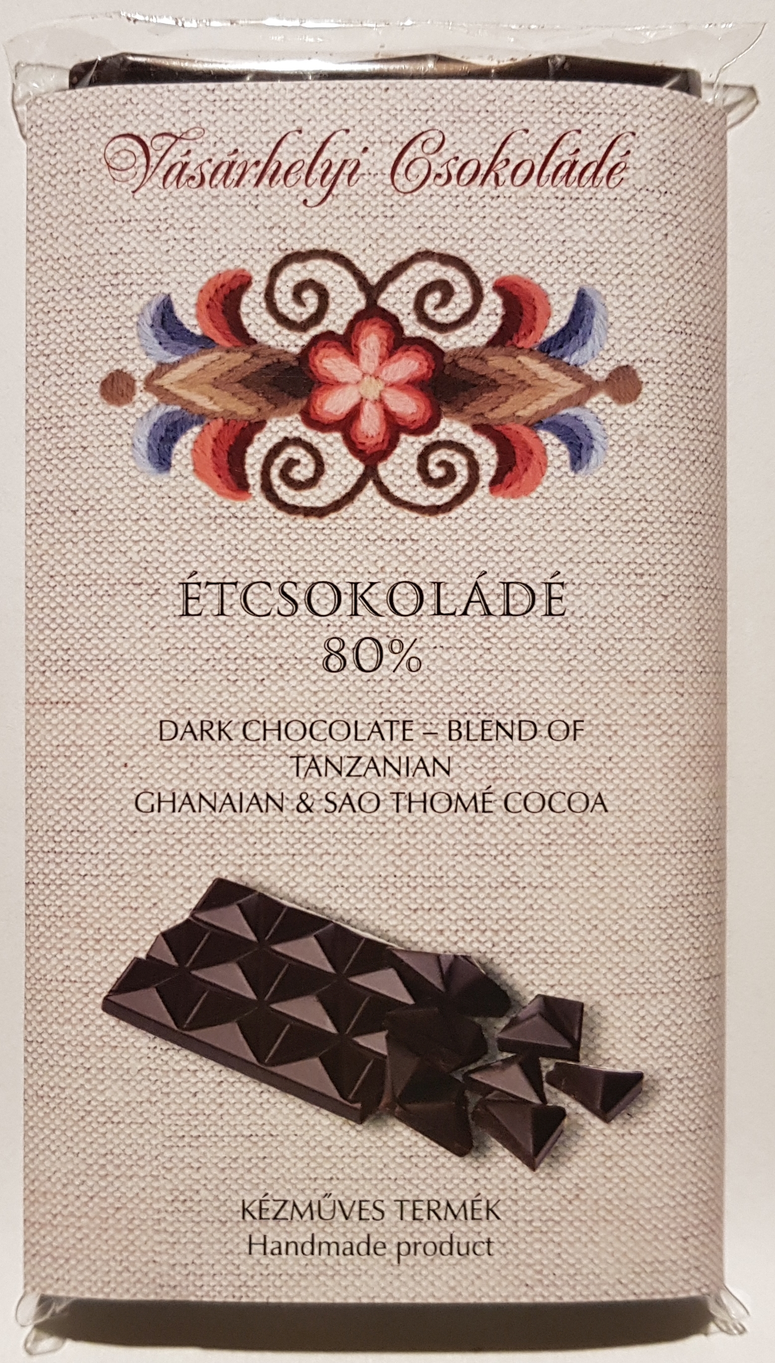 Összetevők: Kakaómassza, kakaóvaj, cukor, emulgeálószer: szójalecitin, természetes vanília, kakaó szárazanyag tartalom legalább 80,1%.